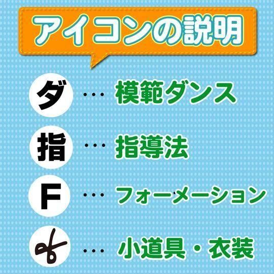 収録内容 | ・模範ダンス ・指導法 ・フォーメーション ・衣装や小道具の説明 |